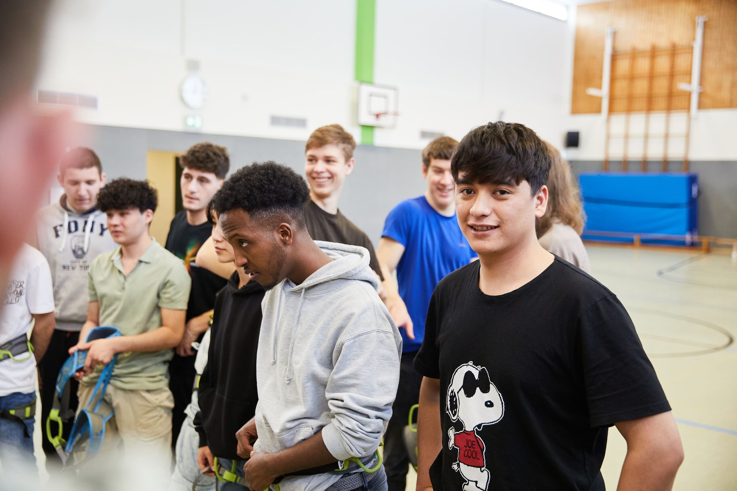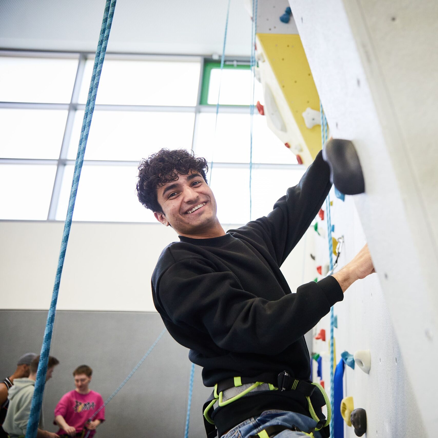 An der hauseigenen Kletterwand (und später ggf. in der Nordwandhalle) sollen die Schüler:innen über sich hinauswachsen (-klettern). Nach einer intensiven Sicherheitsschulung liegt der Fokus im „Toprope“ Klettern (durch ein Seil von oben gesichert), wobei ein wesentlicher Punkt das gegenseitige „Spotten“ und Sichern ist.