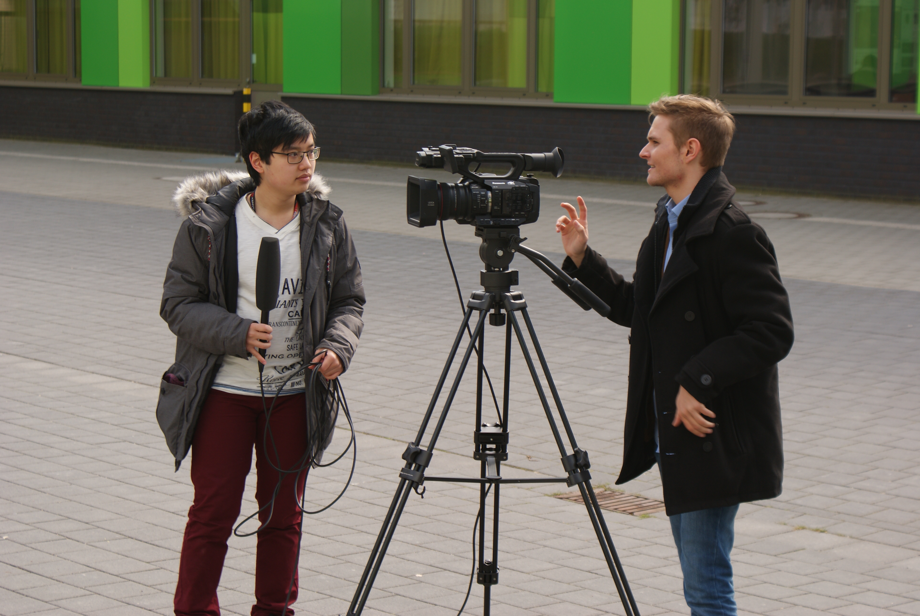 Leon Grabowski (rechts) und sein Assistent Anh Sang Tran befragen Lina Rademacher (hinten) und Celina Cruz (HH15C) für den Film.