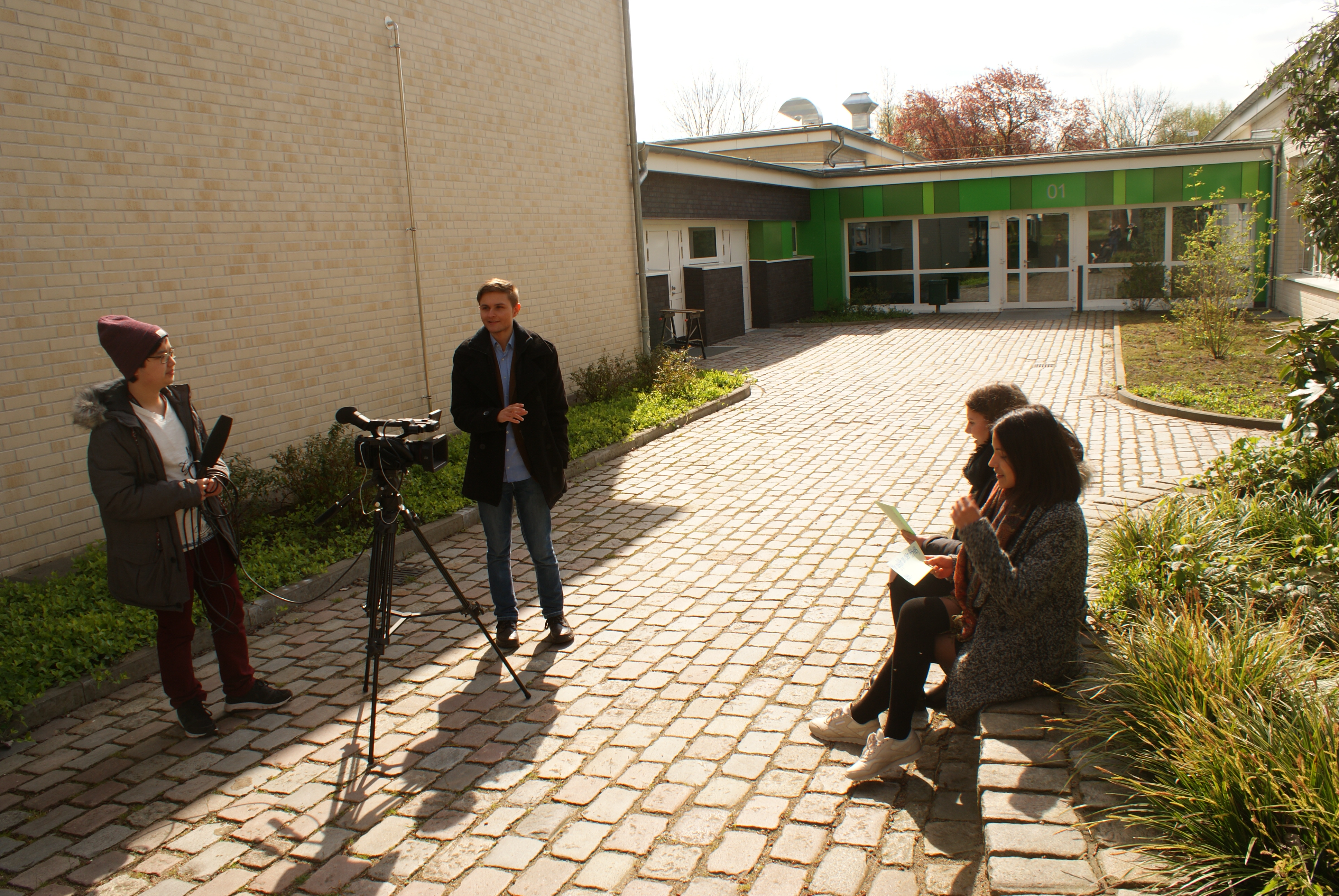 Leon Grabowski (rechts) und sein Assistent Anh Sang Tran befragen Lina Rademacher (hinten) und Celina Cruz (HH15C) für den Film.
