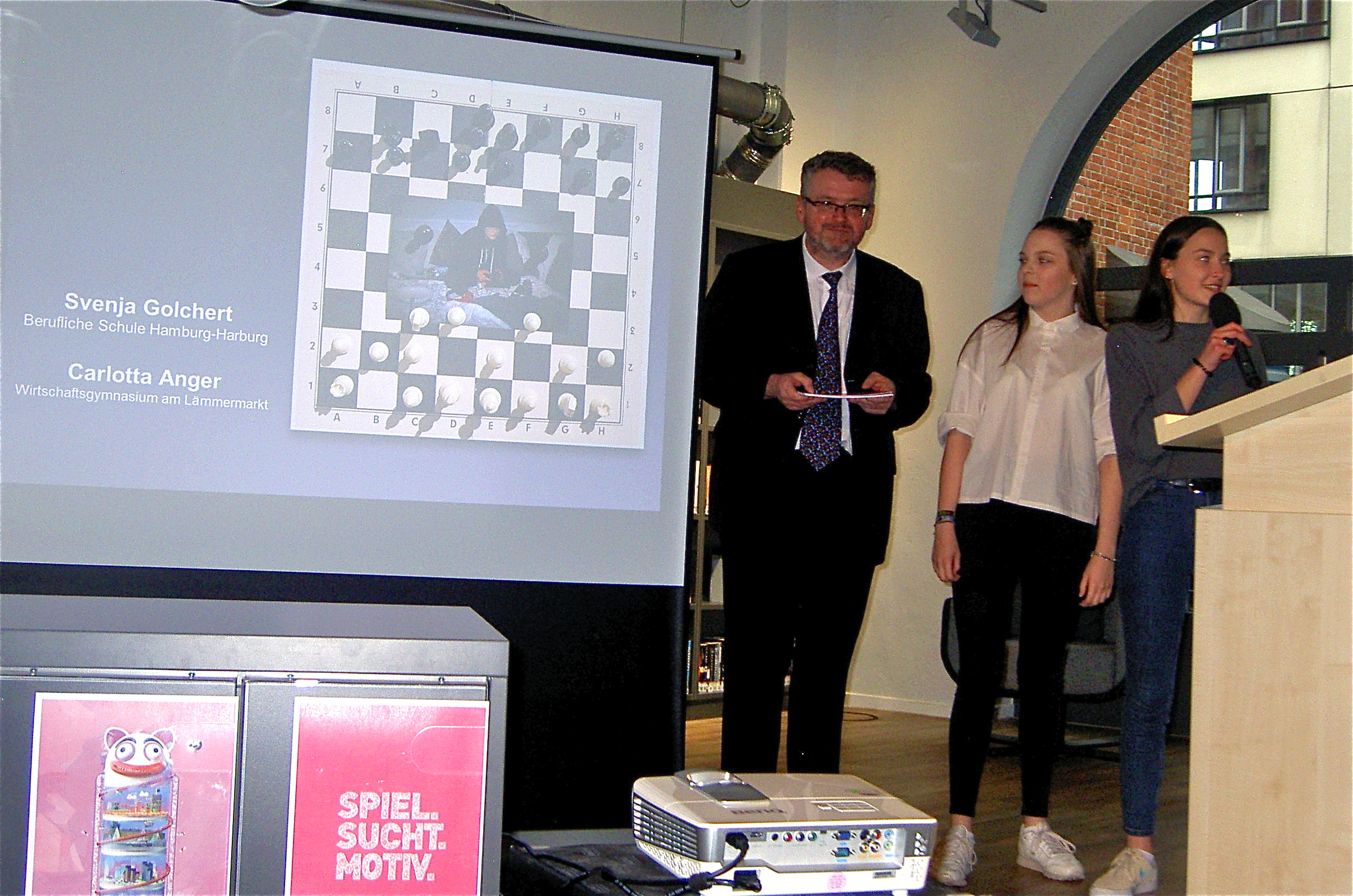 Die Schülerinnen erklären dem Publikum die Idee zu ihrem Motiv.
