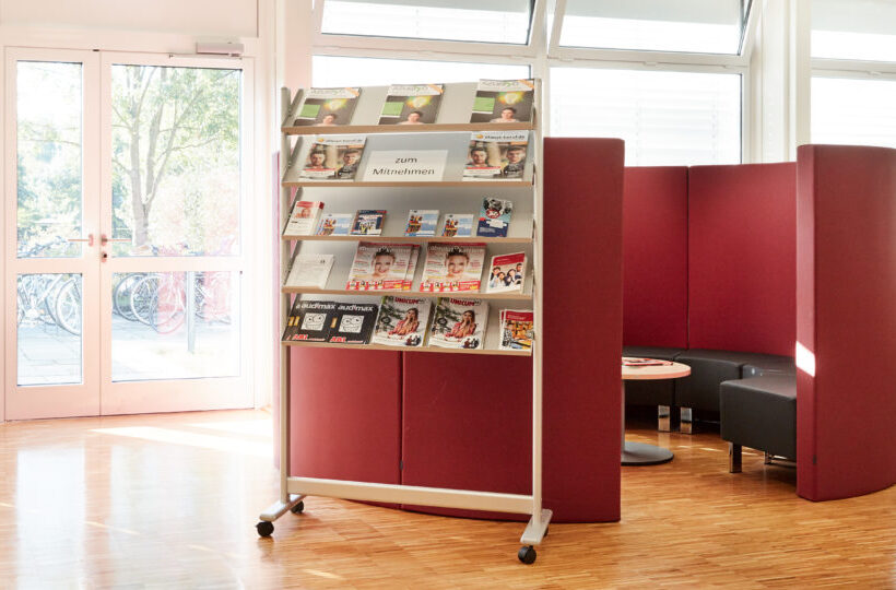 Die Mediathek bietet moderne Arbeitsplätze, vielfältige Medien sowie ruhige Einzel- und Gruppenarbeitsbereiche und unterstützt so konzentriertes Lernen und Arbeiten.